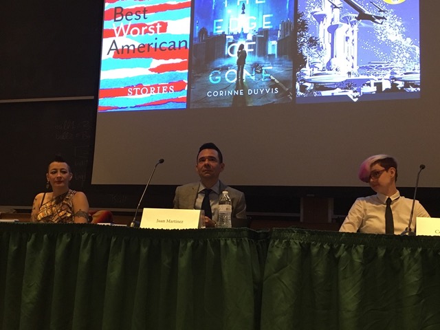 I’d never been to the town of Hanover before and it seemed lovely and absolutely full of students. The panel and reception were held in the Filene Auditorium, which, of course, was in the basement. NYT bestseller and author of the recent hit The Mere Wife, Maria Dahvana Headley, the principle award judge for the award this year, was the chair of the panel (bad pre-panel pictures below, sorry!) and she had some fine questions for Martinez (who was brought in from Chicago) and Duyvis (who came in from Amsterdam) — Lavie Tidhar was travel-delayed as he came in from London and arrived in time for the reception.