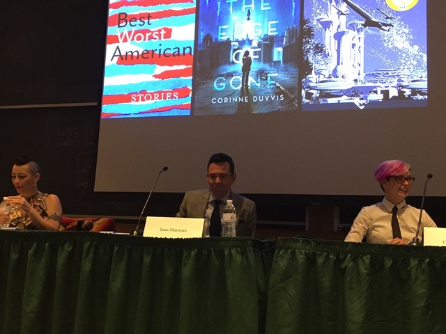 I’d never been to the town of Hanover before and it seemed lovely and absolutely full of students. The panel and reception were held in the Filene Auditorium, which, of course, was in the basement. NYT bestseller and author of the recent hit The Mere Wife, Maria Dahvana Headley, the principle award judge for the award this year, was the chair of the panel (bad pre-panel pictures below, sorry!) and she had some fine questions for Martinez (who was brought in from Chicago) and Duyvis (who came in from Amsterdam) — Lavie Tidhar was travel-delayed as he came in from London and arrived in time for the reception.